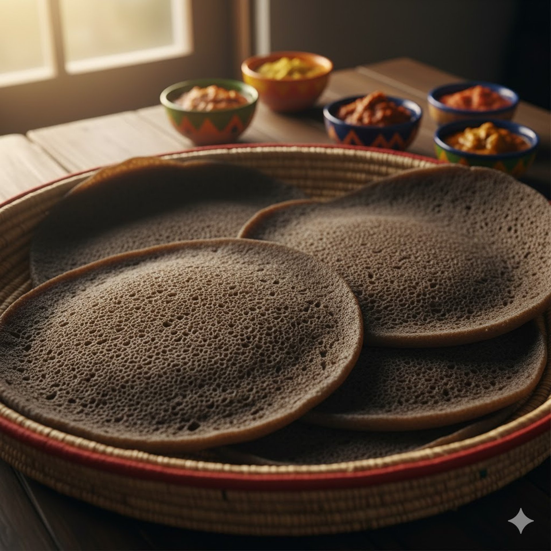 Daily baked injera made with care. በትክክለኛ እና በእንክብካቤ የተጠራቀም እንጀራ።